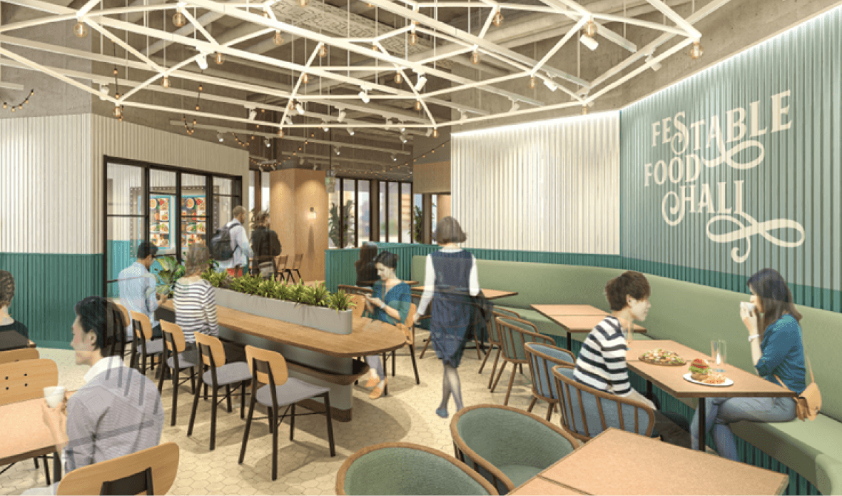 【WELLSIDE TABLE】は、日本語で『井戸端』という意味をもつ【WELLSIDE】と“賑やかさ” “憩いの場所”の中心である【TABLE】 を組み合わせた、フードコート。