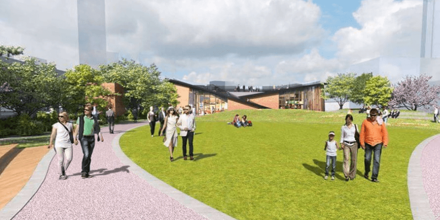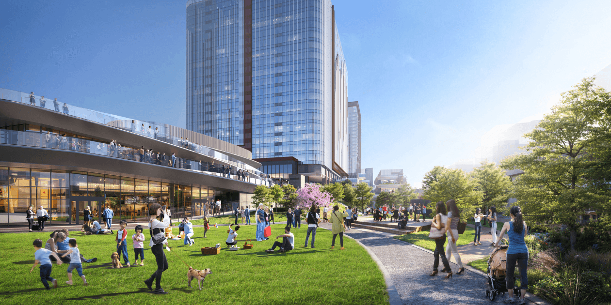 OIMACHI TRACKSで最も広い4,600㎡の広場です。大きな芝生や桜などの植栽、カフェやレストランで、居心地の良い時間を提供します。また、さまざまなイベントも実施予定です。