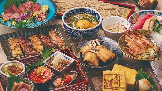 二種の打ち立て蕎麦を自由に愉しめる蕎麦居酒屋。多彩なつけ汁や厳選された日本酒、一品料理を和モダンな空間で堪能できます。